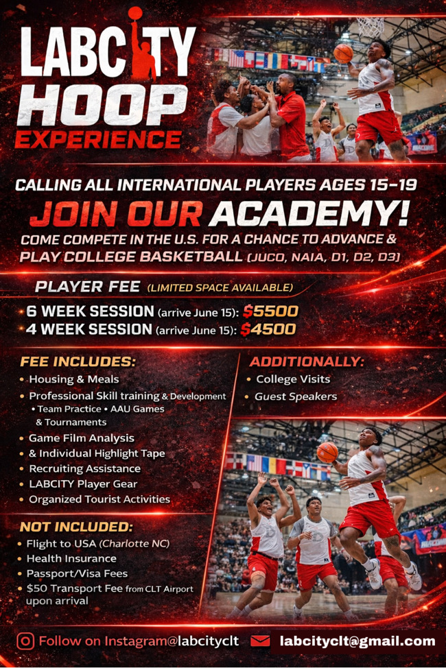 Are you ready to train at a high level? Play at a high level? The LABCITY HOOP EXPERIENCE gives international players a taste of both. This is for serious players looking for the opportunity to compete and get maximum exposure. See flyer below for details. Players will receive meals & lodging as part of their registration. 50% deposit due at registration and balance is due by May 15th. Deposit is non refundable